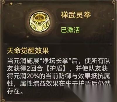 元润的基础技能几乎和普通的禅修弟子没有任何区别,在其二阶觉醒技能出来前因为五行灵根无法携带复活技能的问题导致连上一队的机会都没有。但是现在!“大人,时代不同了。”首先我们可以看到的是通过二次觉醒的元润拥有了这个游戏最大的核心之一“在动”,当每次行动结束时如果自身没有携带任何的减益状态则可额外释放“净坛长拳”。再配合另一个觉醒技能,当元润释放“净坛长拳”后使所有队友获得2回合的护盾,并获得元润当前20%防御和效果抵抗。注意这里写的是当前并不是基础,所以这也顺带可以提到和我们元润契合度及高的道兵“长夜请寒”