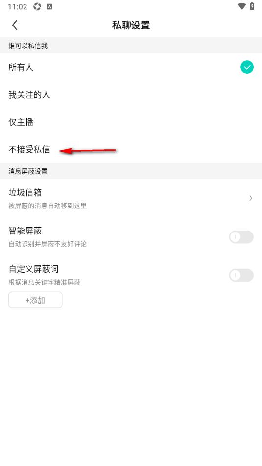 4.这时候我们就可以在打开的窗口中选择【不接受私信】选项即可,如图所示。