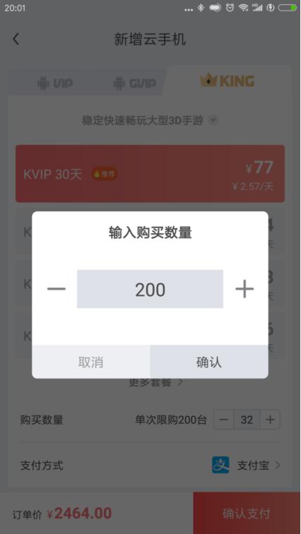 填写并确认云手机购买数量,目前单次最多购买200台云手机;