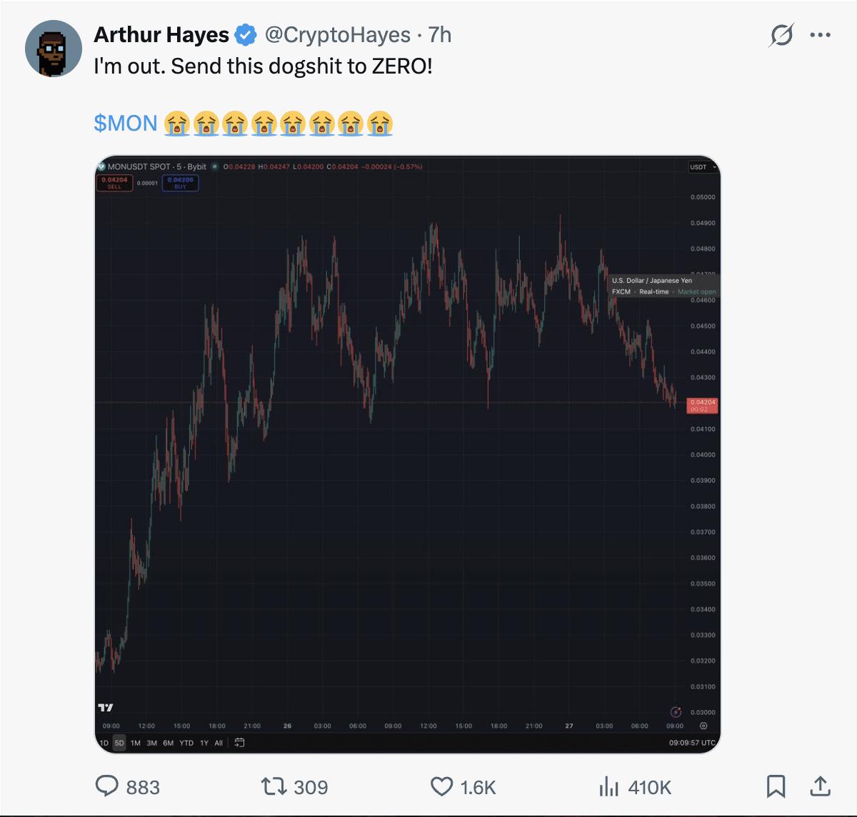 Arthur Hayes 和 单子 [MON] 之间发生了什么?