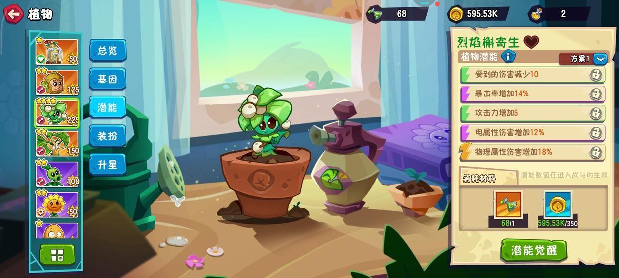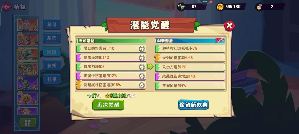 2、在潜能界面,点击右下角的“潜能觉醒”按钮,会刷新植物的潜能属性,有不同等级(颜色)属性区分,大家可以根据刷新的潜能属性数值的高低进行保留。每次潜能觉醒需要消耗“潜能药剂”和金币,如果锁定某个潜能不觉醒,还需要消耗“潜能锁定剂”