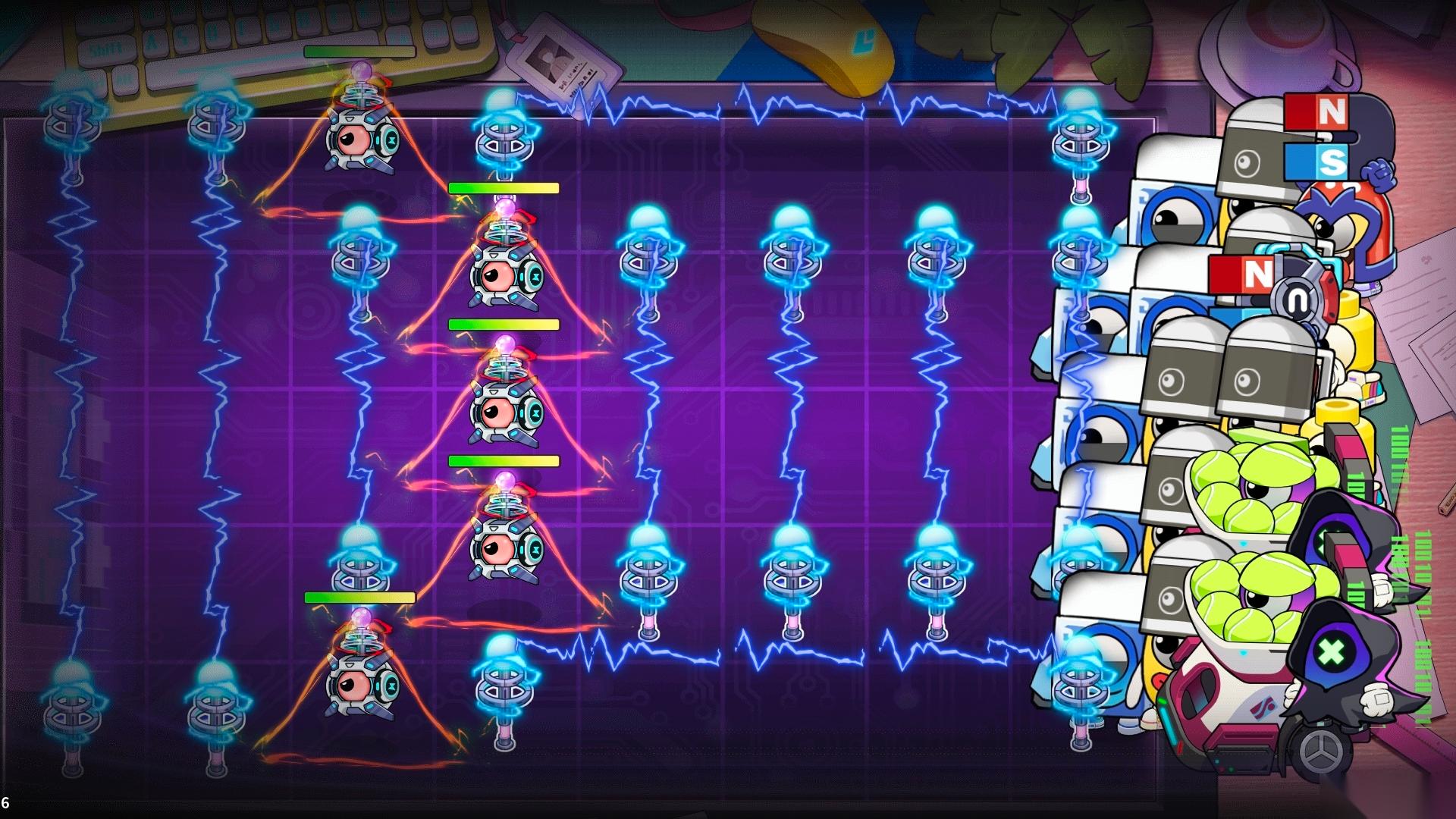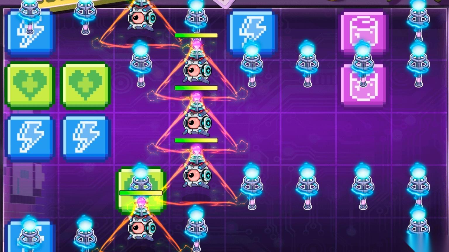 地图初始会随机刷新部分增益地砖(给饮料的地砖相对靠前),电玩角色放上面获得对应加成(增伤、回血、获得饮料),每过1分钟重新随机刷新一次,微型机接触之后地砖立即消失并对微型机进行强化。