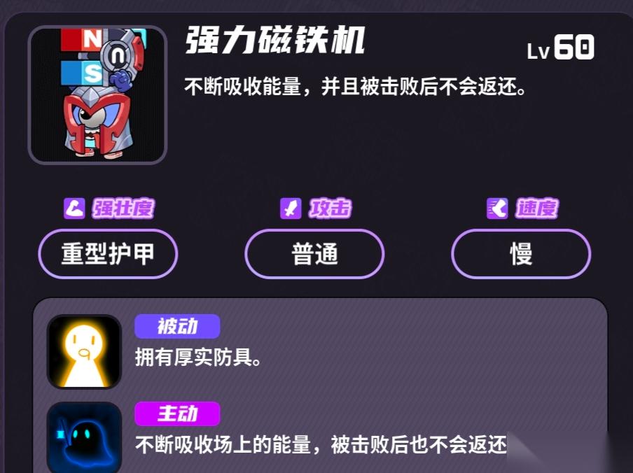 ②强力磁铁机/磁铁机,每过约7秒吸取场上所有阳光,进场时如果场上存在阳光立即进行一次吸取,被击败后强力磁铁机不会返还被吸取的阳光。吸取时不进行攻击与移动,血量中等,建议优先解决。