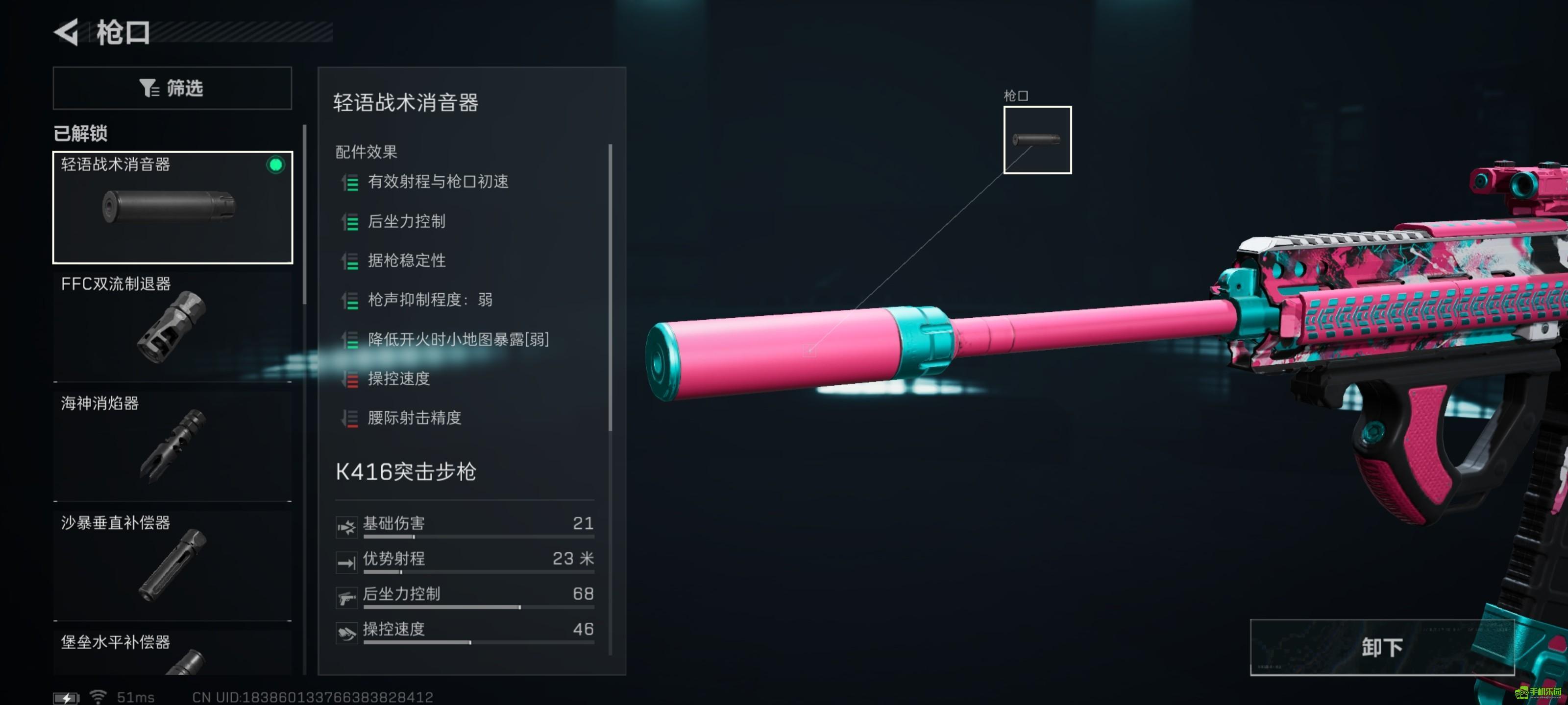 枪口选择轻语战术消音器。这个枪口可以在K416的射程上弥补一些缺点。