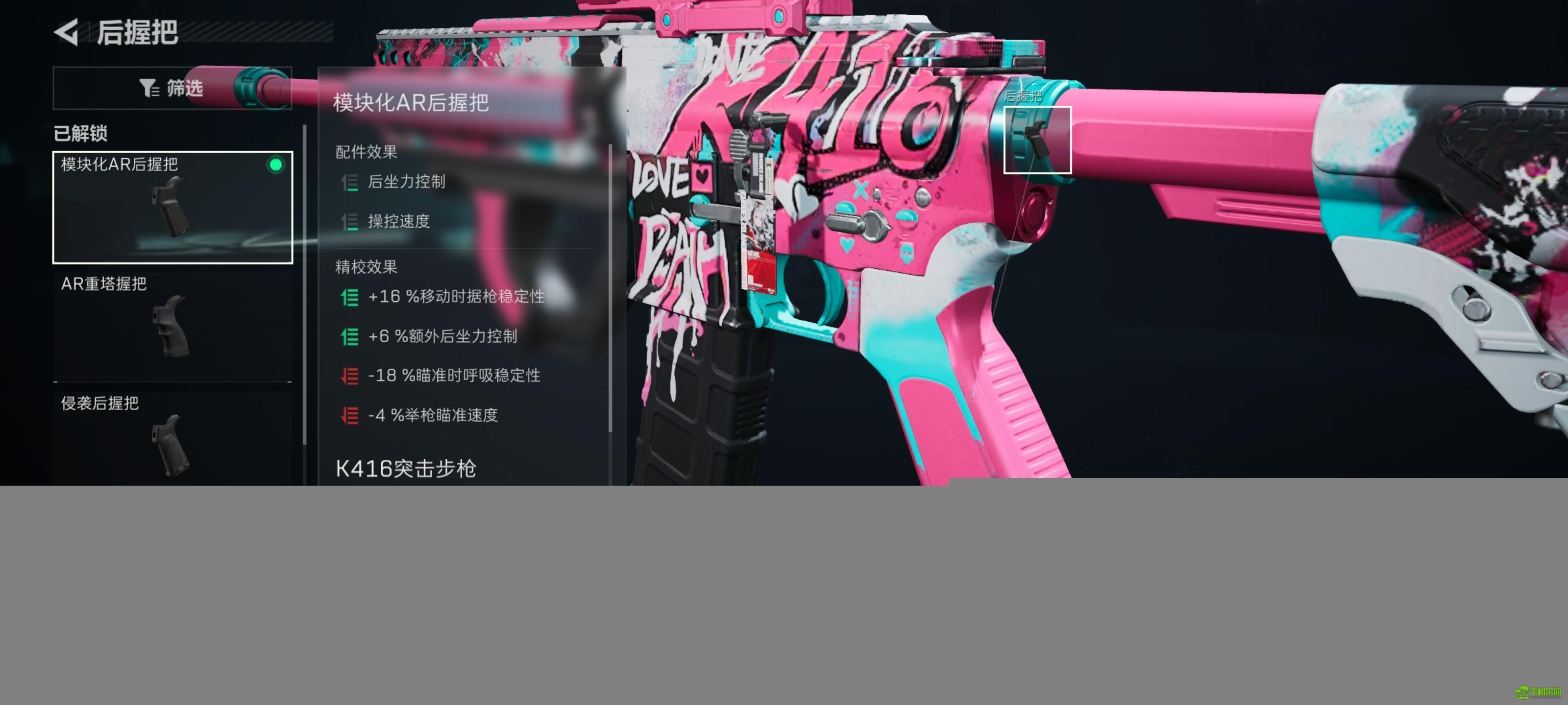后握把选择模块化AR后握把以及AR重型握把片。可以有效提升枪械的稳定性。