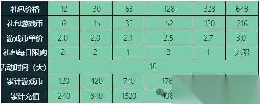 上面整理了不同礼包对应的游戏币数量,以及按10天活动时间计算,每日购买不同档位礼包最后所能获得的游戏币总数。
