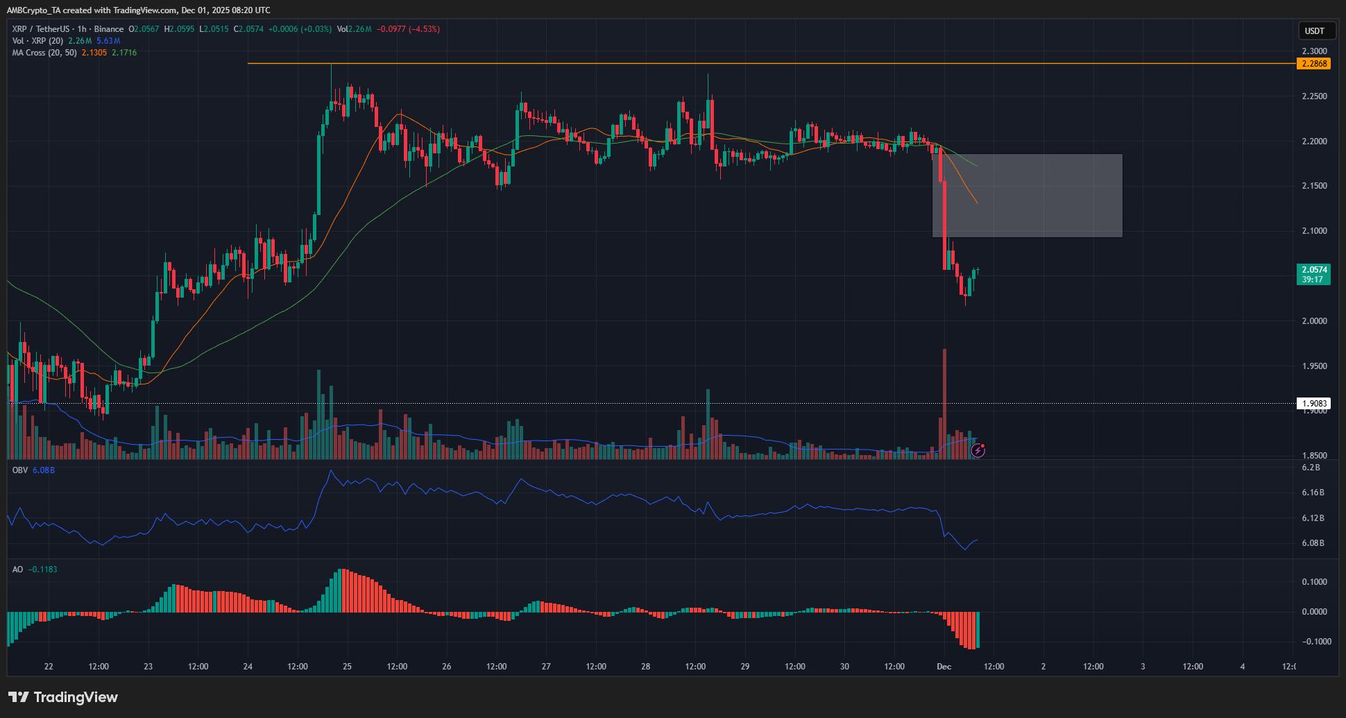 XRP 多头几乎无法将价格推高至 2.2 美元以上并维持在该水平,这一事实表明了卖方的实力。