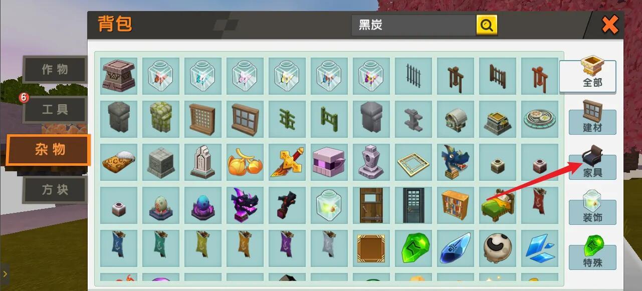 2.点击杂物菜单里面的家具按钮,查看所有家具。