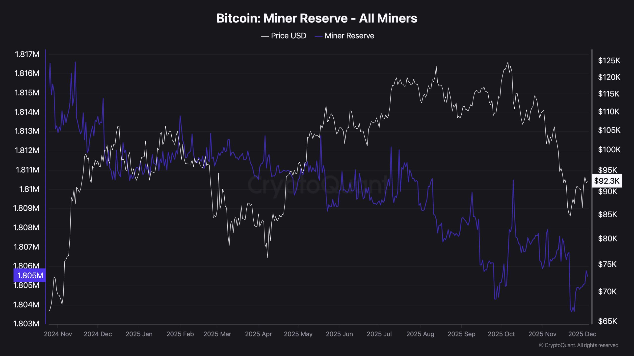 从 11 月 26 日到 12 月 5 日,矿工储备攀升至约 180 万 BTC 的新高。