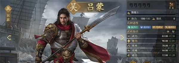 吕蒙:白衣渡江的经典人物,在吴国阵营当中吕蒙这个角色目前放在阵容当中,他可以带来的一个基础能力也是有谋略方向的加成,不过阵营里面非常普遍的能力,也就是谋略类型的伤害,但是他除了此类伤害智力加成之外还有的一个额外状态,就叫做束手,虽然利用这样的一个状态可以带来的时间比较短,但是可利用程度还是比较高的,而且有些阵容当中大家还可以利用他的这类技能,带来20%的概率触发一次反击,这个反击效果就可以为对面的目标带来一定的谋略类型伤害,并且在其中还有40%的概率,会触发一个我方武将在普攻以及突击技能上面可以带来的影响效果,也就是敌方在攻击我方武将使用的是这两种战法的时候,在上面我方武将受到的伤害数值上面会降低50%的数值,所以针对我方在受到对面强力打击的时候,其实这样的技能正好可以用来给我方的武将进行减伤使用。