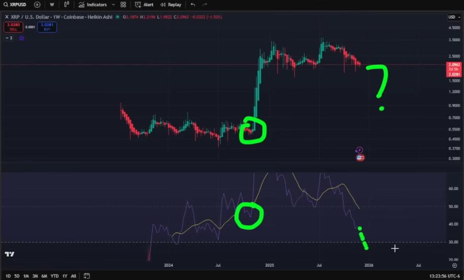 作为参考,XRP 周线图上的第一个底部是 $0.52024年11月。与此同时,第二低谷可能休息周围的该地区预计闪崩,成型更高的低点。然而,在此期间,RSI 在 2024 年 11 月形成了 44 的初始底部,而下一个底部可能低于 30,标志着更低的低点。