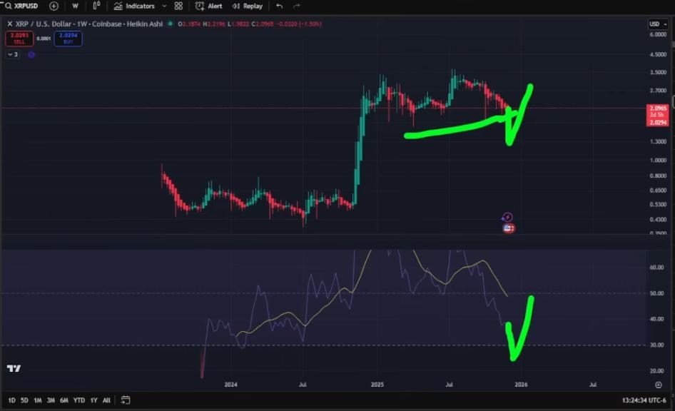 随后,他将注意力转移到了XRP RSI指标上。引起人们的注意周线图上出现了一个隐藏的看涨背离。当 XRP 价格创出更高低点而 RSI 指标创出更低低点时,就形成了这一隐藏的看涨背离。