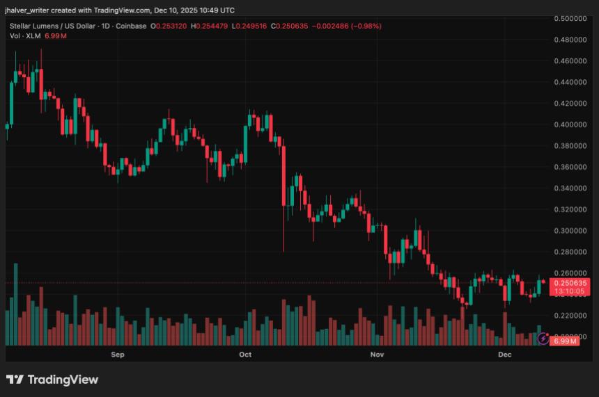 尽管实用性方面势头强劲,XLM 仍处于其最重要的技术区域之一。自 2024 年 11 月以来,该代币一直呈下降趋势,目前交易价格略高于 0.245 美元的水平支撑位,该支撑位在过去一年中多次阻止了其进一步下跌。