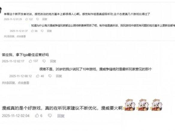 当然,开发者的努力玩家也都看在眼里,在《漫威争锋》官方发布的最新开发者更新视频的评论区,不乏玩家为游戏运营点赞和对游戏取得TGA年度最佳持续运营的祝福。