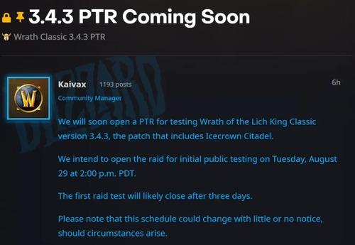 暴雪社区管理员Kaivax表示很快将开放测试巫妖王之怒怀旧服3.4.3的PTR,该补丁包含版本最终团队副本——冰冠城堡,届时玩家将可以直面巫妖王的怒火。