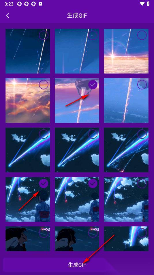 4.这时候即可查看到视频素材会被分解成很多张图片,点击勾选需要制作的GIF动图图片,然后点击下方的【生成gif】选项即可完成。