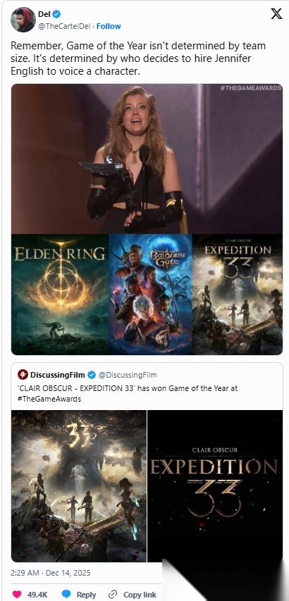 TGA 2025 颁奖典礼过后,网路社群上掀起了一波有趣的讨论。有网友发现,荣获本届“最佳表演”奖项的《光与影:33号远征队》(Clair Obscur: Expedition 33)人气角色玛艾儿配音员 Jennifer English,似乎自带“年度游戏”的超强运气体质。因为回顾近年的得奖名单,只要是她参与配音的游戏作品,最终都顺利拿下了象征最高荣誉的“年度游戏”(Game of The Year)。