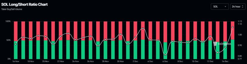 衍生品方面,CoinGlass数据显示SOL的多空比率为1.07,创下一个多月以来的新高。该比率高于1表明市场看涨情绪浓厚,交易员押注该资产价格将上涨。
