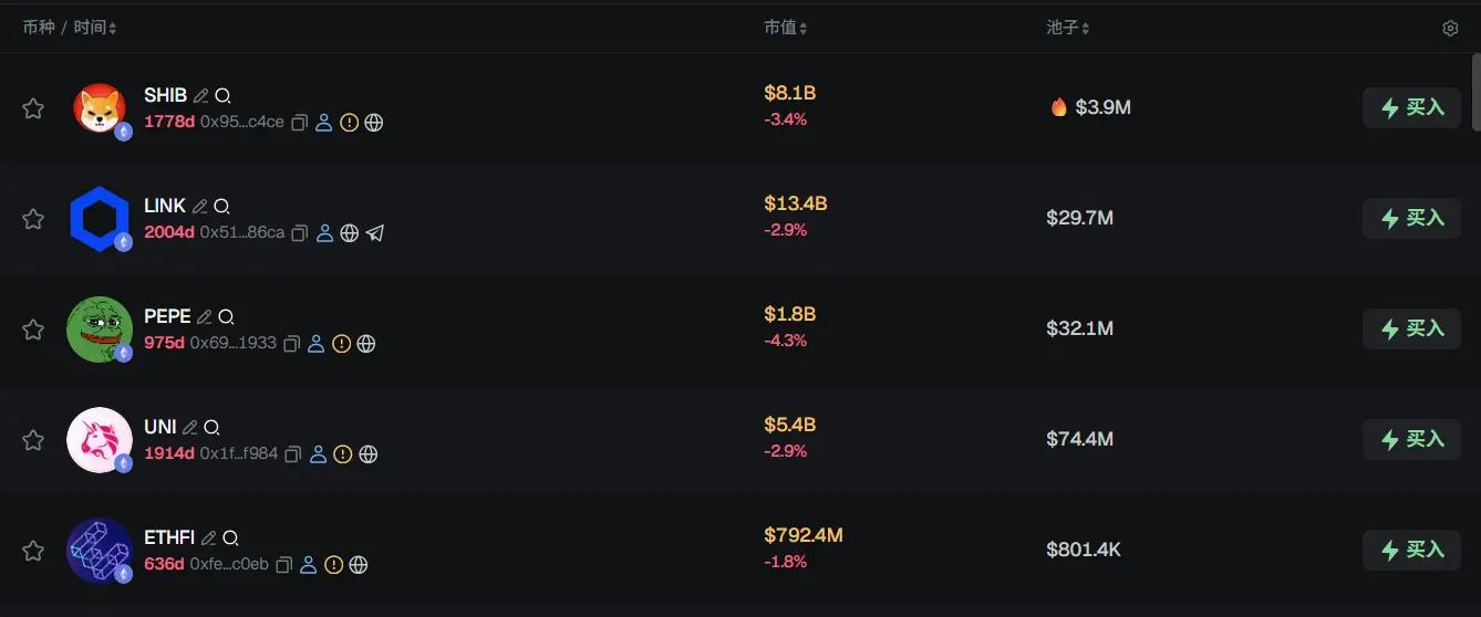 过去 24h ETH 热门代币前五依次为:SHIB、LINK、PEPE、UNI、ETHFI