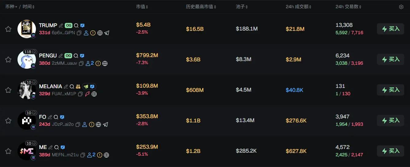 过去 24h Solana 热门代币前五依次为:TRUMP、PENGU、MELANIA、FO、ME