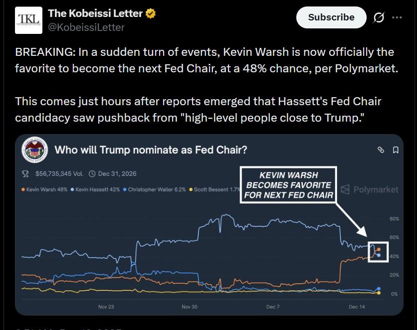 根据最新分享的信息科贝西的信根据Polymarket市场的数据,凯文·沃什目前以48%的概率成为最热门的美联储主席人选。而就在几个小时前,有报道称,哈塞特的美联储主席之位之争遭到了与特朗普关系密切人士的阻挠。