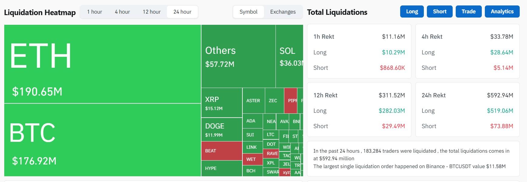最新的暴跌消息显示,短短24小时内,超过5.92亿美元的加密货币仓位被强制平仓。这波大规模抛售是今日加密货币清算新闻背后的主要原因之一。
