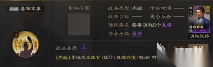 首先要了解的是,善审军事这个战法的效果就决定了这个战法只能给到内政文官角色身上,这个战法的作用只有当携带的角色是属于主政关或者练兵使的情况下才能触发。