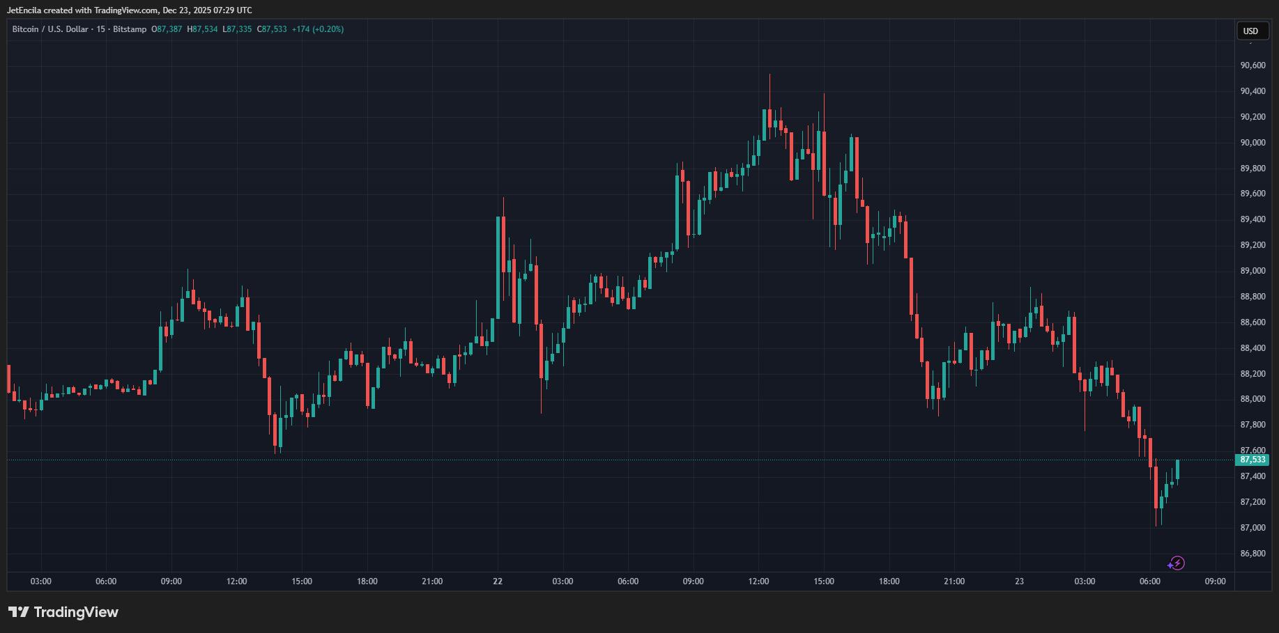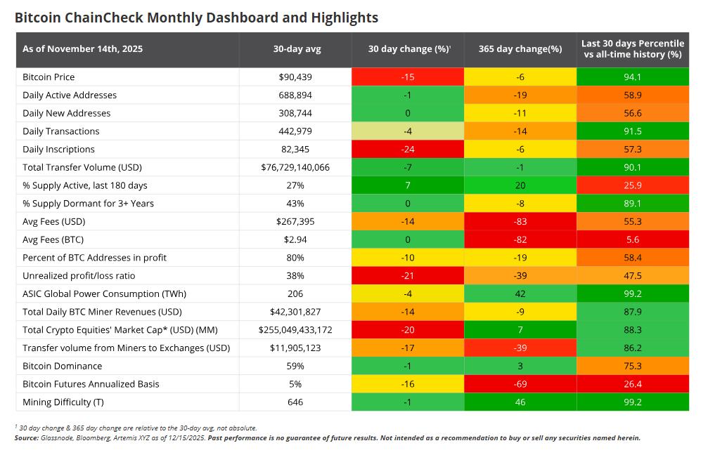 比特币交易价格接近 88,600 美元,较 10 月 6 日创下的历史高点 126,080 美元下跌近 30%。年底市场交投清淡,流动性不足可能会掩盖真正的市场动能。