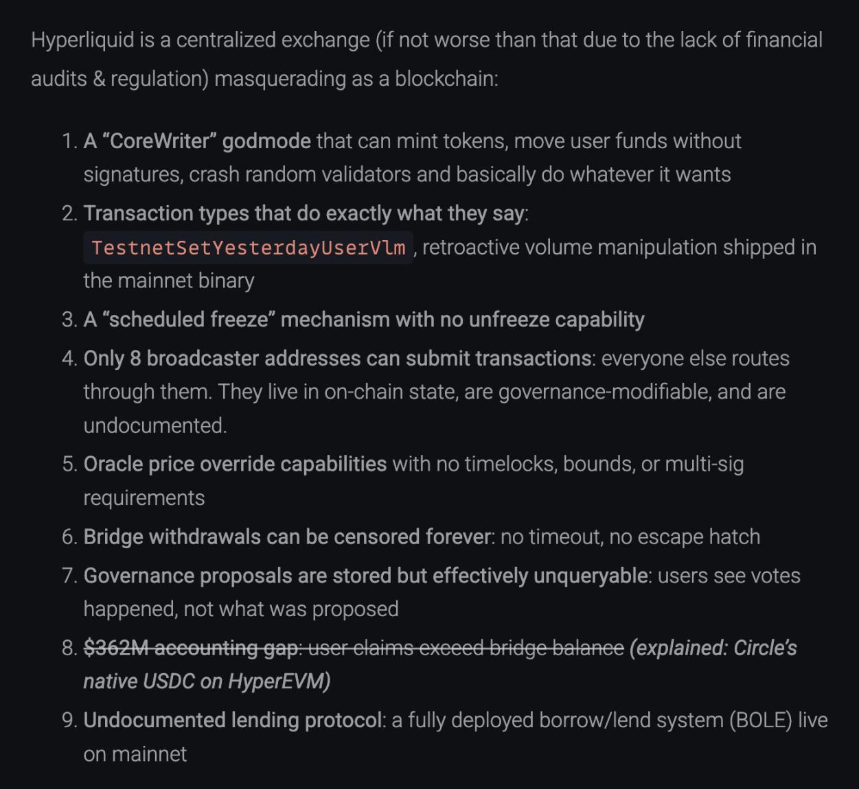 2025 年 12 月 20 日,一篇发布在 blog.can.ac 上的技术文章《Reverse Engineering Hyperliquid》,通过逆向工程直接拆解了 Hyperliquid 的二进制文件,指控其存在从「资不抵债」到「上帝模式后门」等 9 项严重问题。文章直言:「Hyperliquid 是一个伪装成区块链的中心化交易所。」