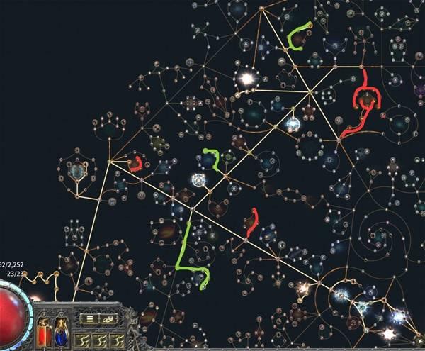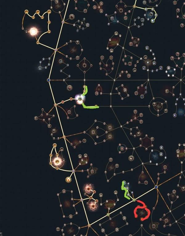 通过升华天赋、副手权杖获得大量精魂,开启大量“光环”,并堆叠“光环幅度”使光环技能的效果更强,开启的光环包括:
