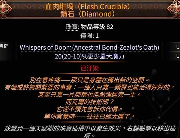 新暗金珠宝-血肉坩埚 可以获得对应的基石天赋效果,这里使用了一颗灭世之语的,获得+1诅咒上限,配合暗金德瑞的诅咒,总计3诅咒上限