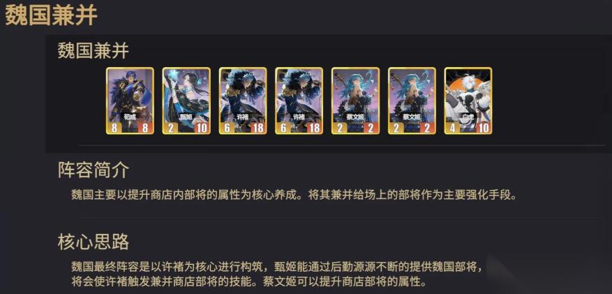 核心的思路会比较清晰,需要把商店里面的部将直接当成养料,可以通过兼并的机制去有效强化场上的核心。这套阵容的终极核心就是许褚,他的技能在准备阶段,可以兼并魏国武将,直接就可以吸取对方身上的属性。养到最后,这就等同于是移动堡垒。在这一套阵容中,甄姬也是不可以错过的,通过后勤的技能就可以给商店一直刷魏国武将,让许诸成为一个不会缺兼并的目标。蔡文姬就可以迅速的提升商店内每一个部将的基础属性,所以每一次的兼并都会更有价值。