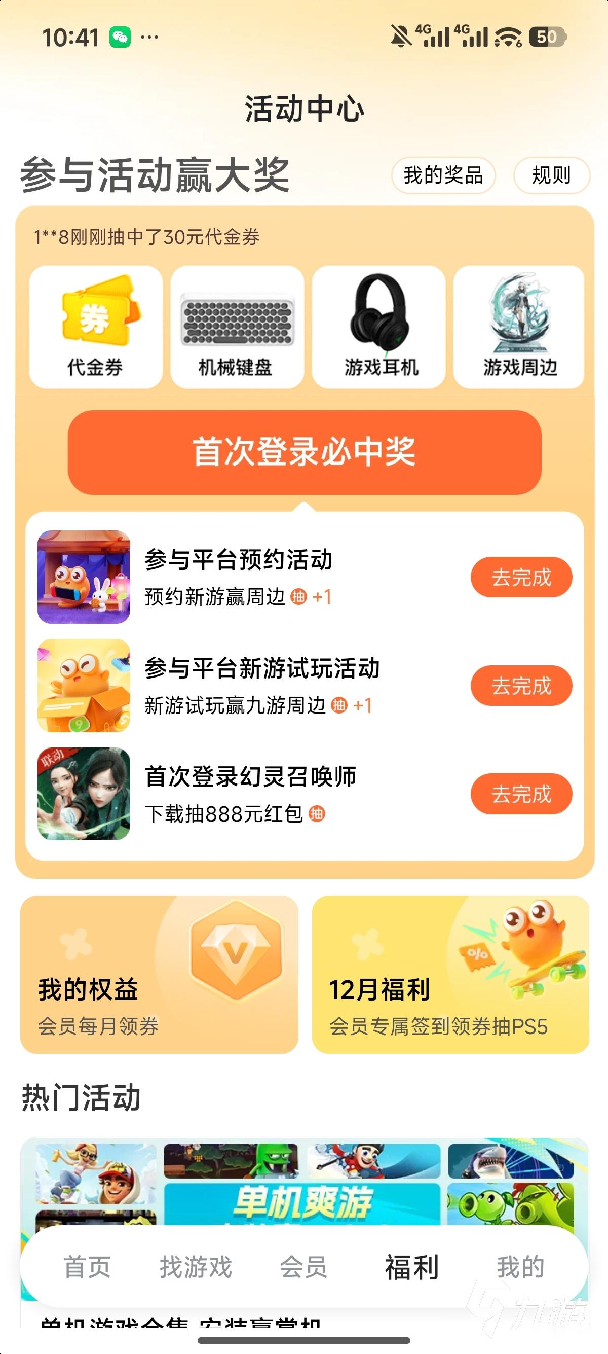 根据了解,平台内带来的福利以及活动很是丰富,比如其中推送的活动中心,大家就可以去了解到不同的福利,比如完成平台给到的体验任务等,就可以让自己获取对应的抽奖机会已经红包等福利,而且还有超多的热门活动自由选择,比如单机游戏的体验就是其中之一,这些活动出现的目的也是为了能让大家更好的去解锁相关福利,让游戏感受更好。