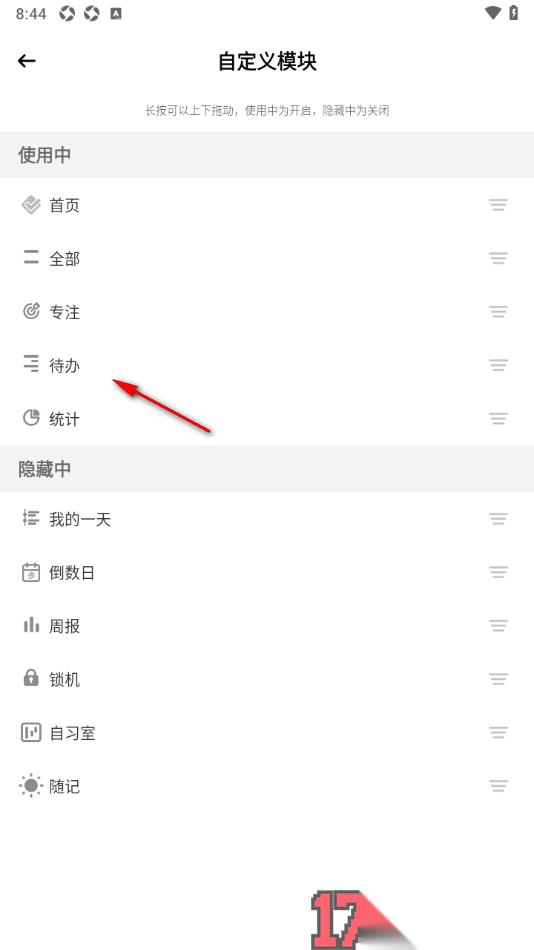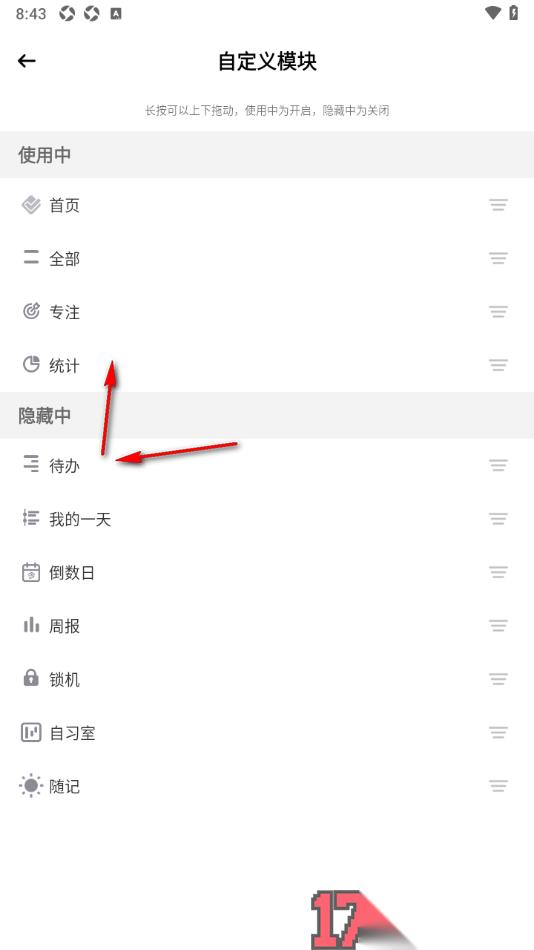 3.页面上即可弹出所有可以设置的模块选项,用手指长按需要设置的模块,比如将隐藏中的【待办】移动到上方使用中。