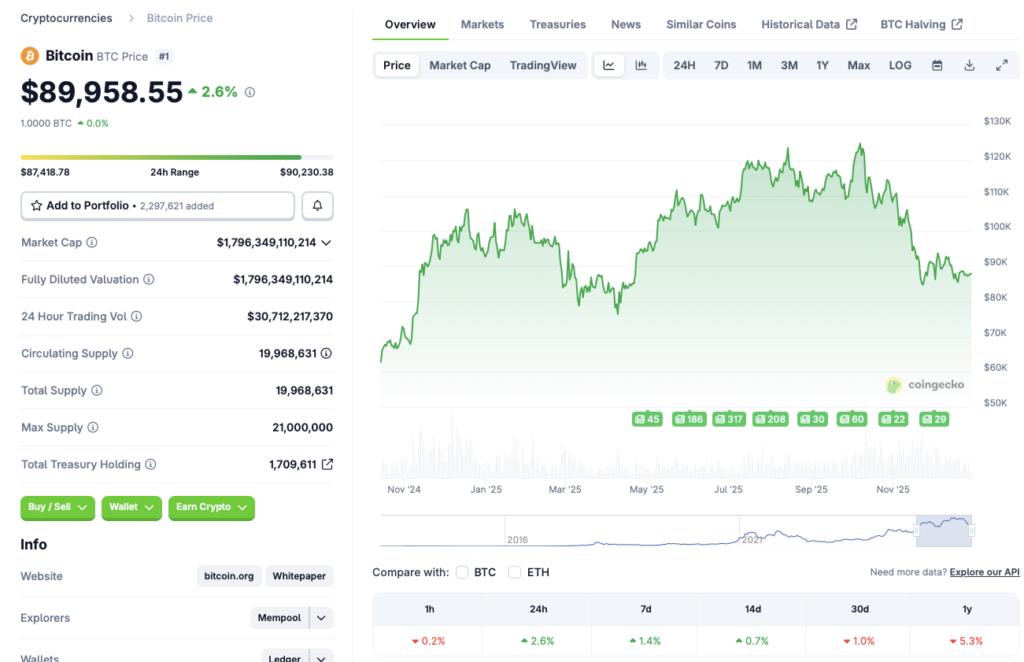 随着2025年接近尾声,比特币(BTC)正努力守住9万美元的价格关口。今年加密货币行业整体表现强劲,但年底形势急转直下。BTC在今年10月曾创下126,080美元的历史新高,但此后下跌超过28%。然而,这种原始加密货币似乎出现了一些反弹迹象。根据 CoinGecko 的比特币数据比特币(BTC)在过去24小时内上涨了2.6%,过去一周上涨了1.4%,过去14天上涨了0.7%。然而,该资产较上月仍下跌了1%,自2024年12月以来下跌了5.3%。让我们来探讨一下2025年对于比特币(BTC)来说是否是糟糕的一年,以及2026年是否会有所不同。
