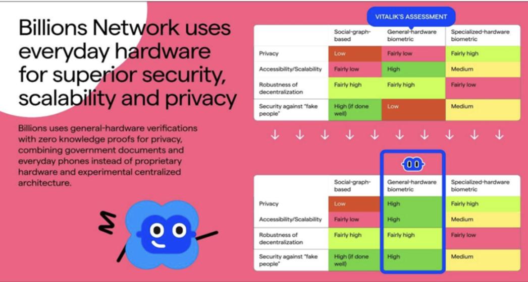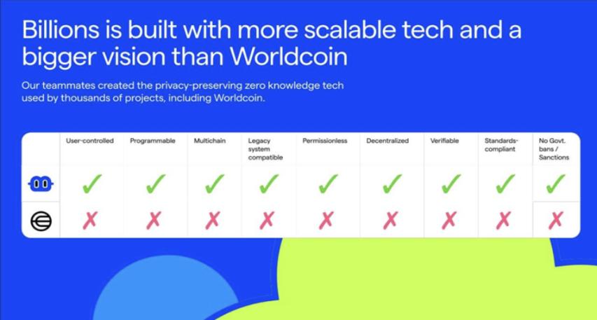相较依赖监控或专用硬件的方案(如 Worldcoin),Billions 以“仅需智能手机”的隐私优先模式,覆盖人类与 AI 双重主体,** 并辅以社区驱动的治理与前瞻性的代币经济,展现出更强的长期可持续性。
