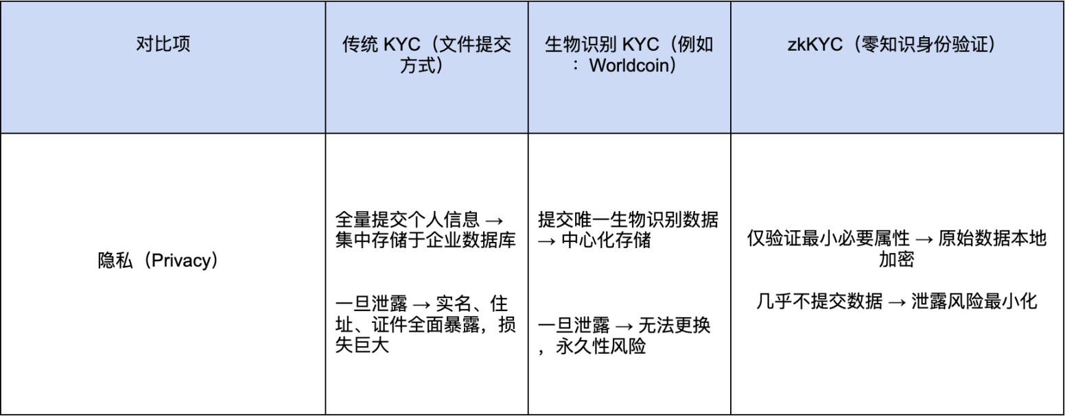 为了帮助理解,以下是一个表格,对比传统 KYC、基于生物识别的 KYC 与 zkKYC 在主要方面的差异: