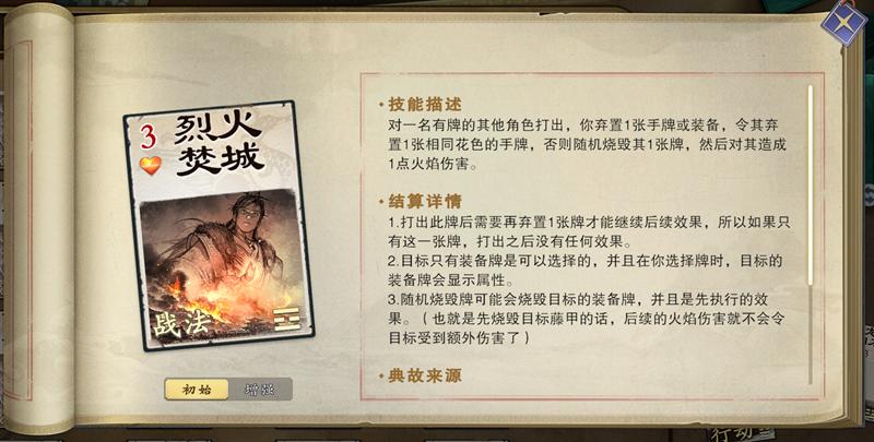 烈火焚城可通过弃掉手牌来令一个角色弃置相同属性的牌,这张牌使用消耗有点贵(浪费1张牌),但可以随机烧牌、直伤,收益也会比较稳定。我们也可以直接选择弃置对手核心的关键牌,起到“破阵”的效果。
