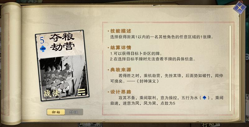 劫营可获得玩家一张牌,可以选择卜卦区,也可以选择目标手牌。这张牌可用来补牌,也可以用来控场。这张牌不太需要留,可以即时使用来获取优势。