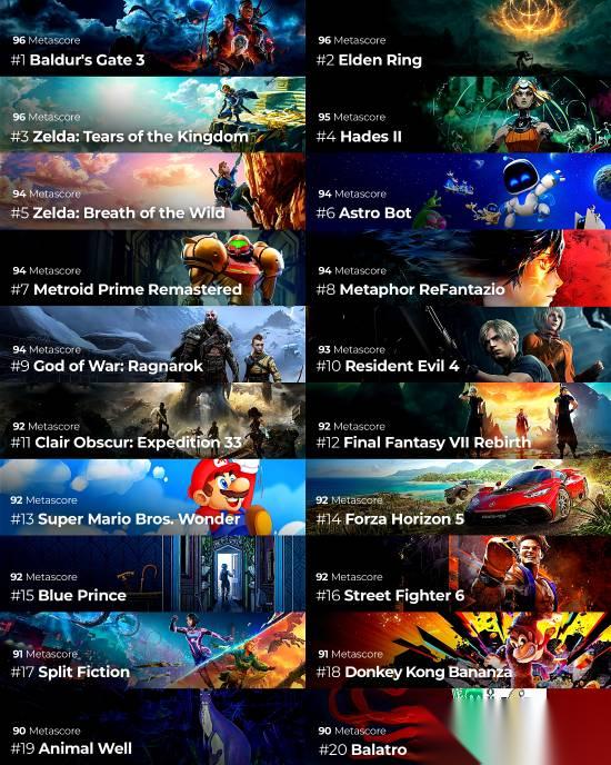 近日,知名博主eStarland汇总了2021年至2025年间,全球权威评分网站 critic上评分最高的20款游戏作品。
