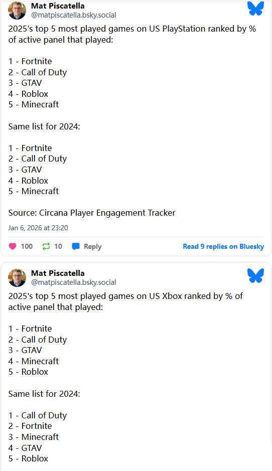 在PlayStation与Xbox这两大游戏平台上,2025年玩家游玩时长位居前五的游戏是完全一样的,按顺序排列为:《堡垒之夜》、《使命召唤》、《给他爱5》(以及《侠盗猎车手Online》)、《罗布乐思》和《我的世界》。需要留意的是,这个排名情况和2024年两大平台的热门游玩榜单毫无二致,仅有的一点小变动是《使命召唤》在Xbox平台上的排名从去年的首位稍微降到了第二位。