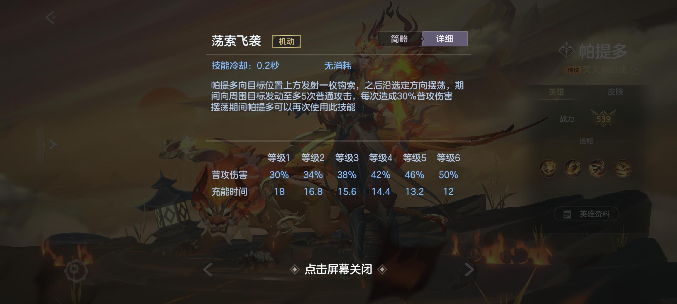 帕提多在摆荡期间会自动发动普攻追击附近的敌人(优先英雄),追击普攻会触发所有的普攻特效,但是伤害有衰减,而且普攻至多攻击五次。