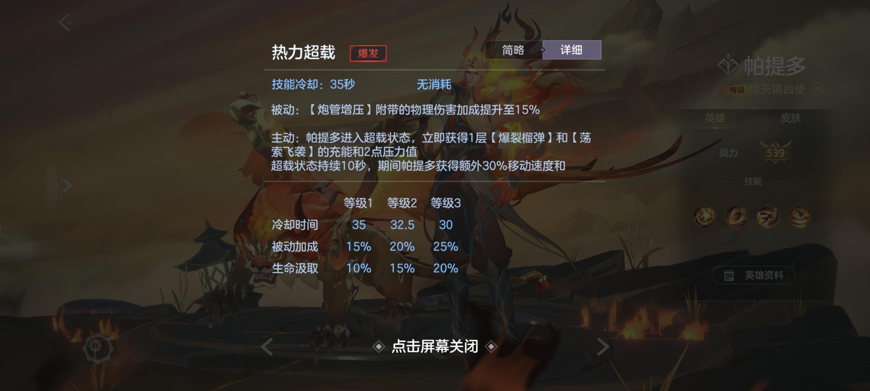 帕提多提升被动附伤数值并立刻为1技能和2技能充能一次,然后增加两点被动充能,超载持续10秒,期间每秒获得一点被动充能,超载中获得额外移速和吸血,强化被动射出12发子弹。