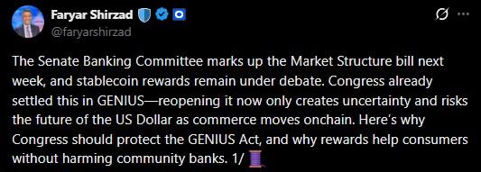 随着美国立法者即将公布期待已久的重大加密货币市场结构法案(通常被称为《清晰法案》Coinbase稳定币奖励已成为最大的争议点。