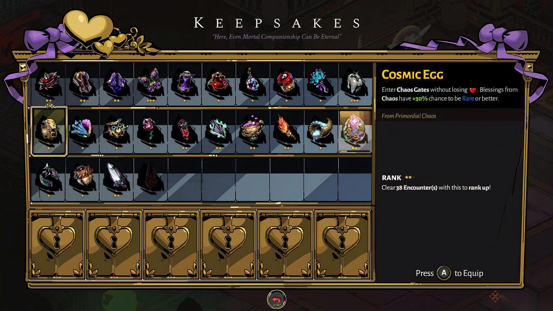 宇宙之卵仅比标准的奥林匹斯信物稍微好一点,纯粹是因为它提供了一项额外的增益,而且你在闯关中使用得越多,它就越方便。不仅混沌的祝福有几率获得稀有或更好级别,你进入混沌之门也不会受到伤害;这有效地降低了风险并进一步提升了收益。