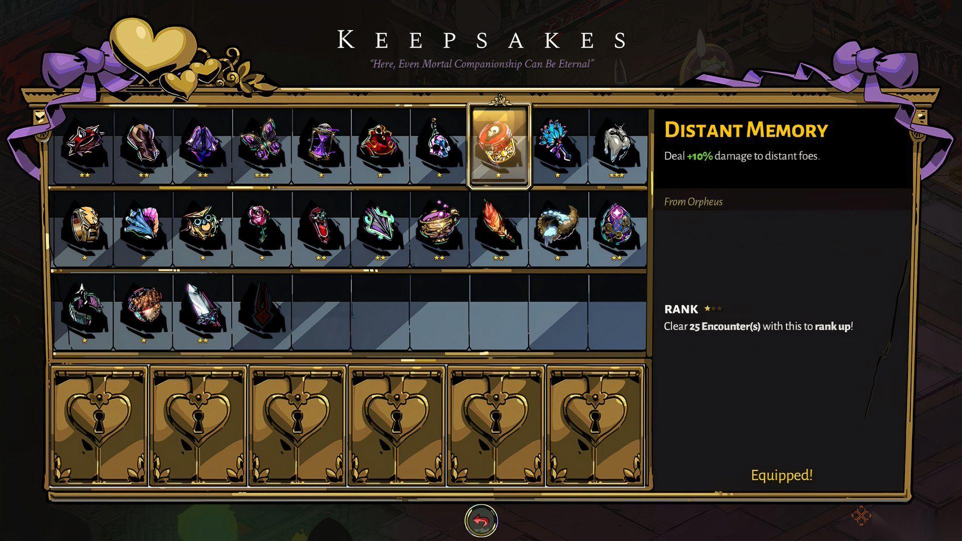 虽然在《黑帝斯》信物排名中处于中游,但遥远的记忆对于某些武器来说是极佳的增益道具。再次提到长距离的索心弓,俄耳甫斯的信物将有效提升几乎所有的远距离攻击(取决于你如何利用地形),但对于近战武器(如冥界之刃)来说则完全失效。