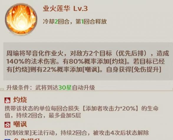 灼烧是属于游戏中最重要的异常状态之一,对方被灼烧后会按照施法者攻击力的20%掉血,最多能叠加到5层。叠加起来之后仅仅是灼烧伤害就很可观。嘲讽效果是对方无法行动,在被攻击四次之后才会解除该状态。免伤提升带来的是10%伤害减免,可以叠加三层。大招是攻击敌方全体,造成法术伤害后,目标身上的每层灼烧都可以提升10%的暴击率,最多提升30%,如果目标身上挂着嘲讽,则本次伤害提升40%暴击伤害。另外还有两个被动,进入战斗后提高自身伤害,回合结束时对随机目标造成真实伤害。战斗开始时就有90%的几率对随机目标添加灼烧。