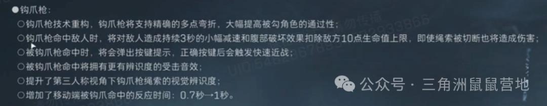 很有意思的改动,首先解释一下被通过性意思就是说钩中人很难再被地形卡住,然后钩中人会有减速效果和创伤效果,即使被切断了也有效果,然后被钩中后有一个QTE,按对了可以触发快速近战直接切断绳子,有意思。