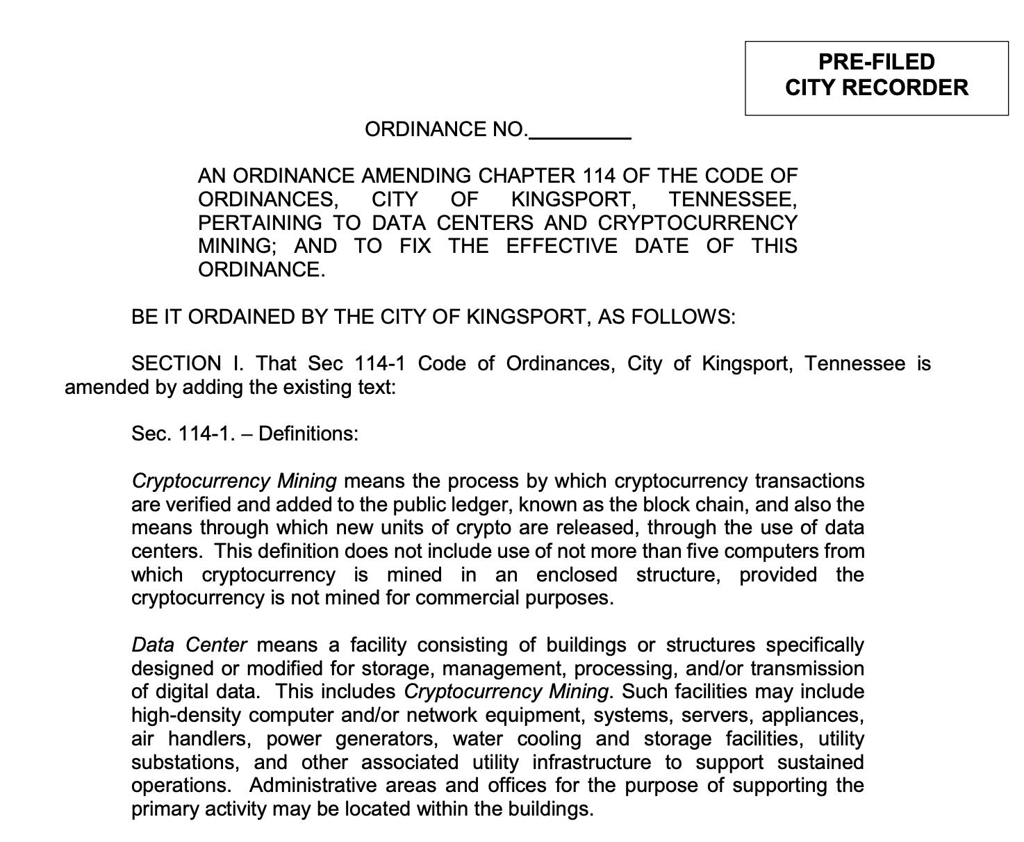 田纳西州Kingsport市市长及议员委员会批准了修改城市分区规则的提案,这可能为加密货币矿业公司和数据中心在当地运营铺平道路。