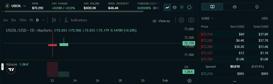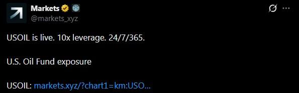Markets.xyz 已正式推出 $USOIL,这是一个追踪美国石油基金 (USO) ETF 的代币化永续合约。此次代币上市将使 Markets.xyz 能够……基于区块链的全天候全球交易最高可达10倍杠杆。